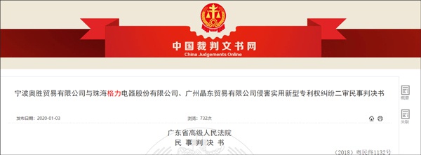图片来源:界面新闻中国裁判文书网资料显示,广东省高级人民法院于2019年8月30日作出(2018)粤民终1132号二审判决,维持广州知识产权法院一审原判,判决奥胜公司向珠海格力电器股份有限公司(下称格力电器)赔偿4000万元。